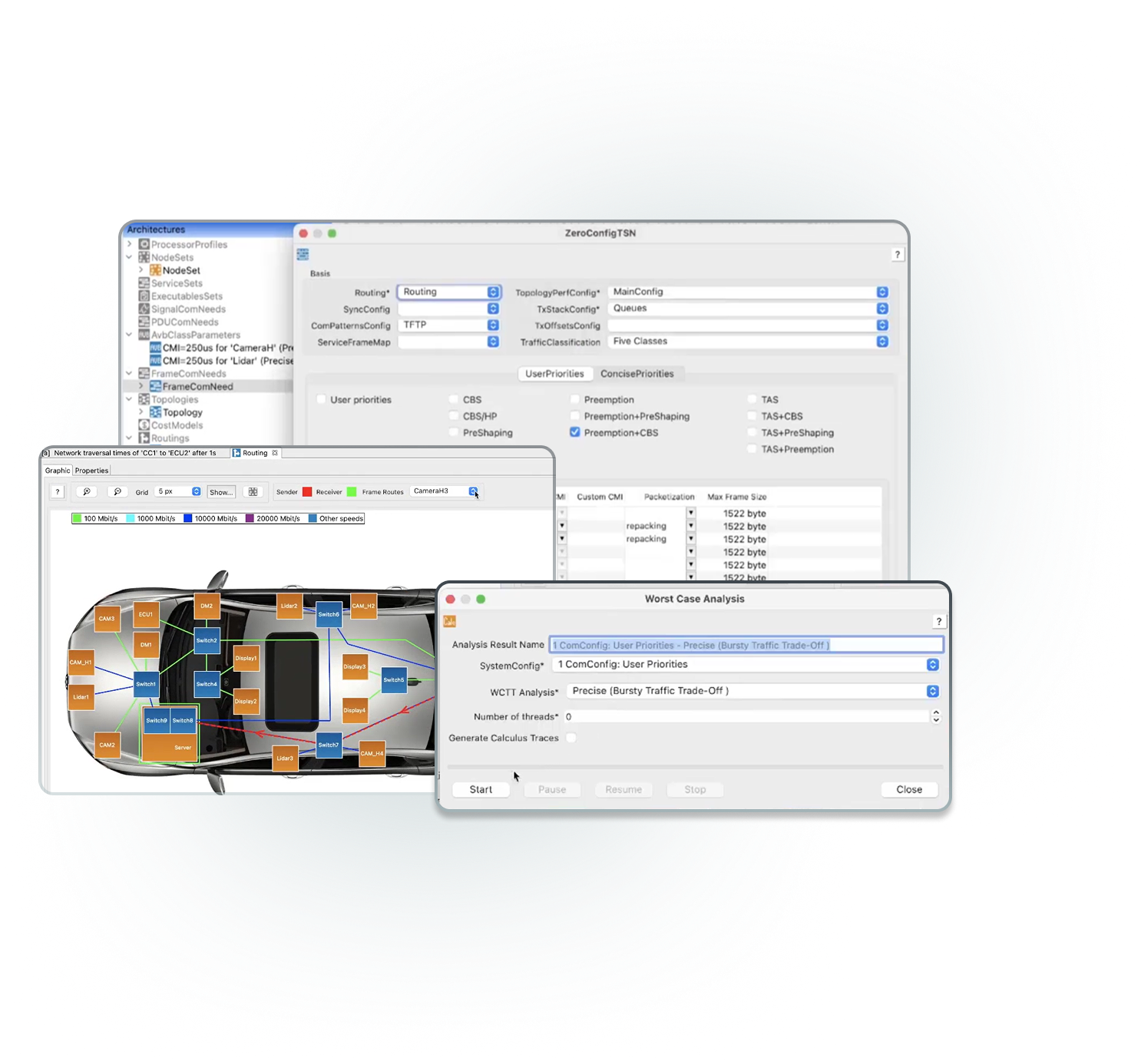 The proprietary ZeroConfig-TSN® algorithm automates TSN configuration (priorities, shaping, scheduling), significantly speeding up network design. Also, because simulation and worst-case analysis are fast (for large networks, in seconds), teams can iterate quickly on different E/E architectures, compare trade-offs, and converge to a robust design — reducing development time, integration delays, and cost.